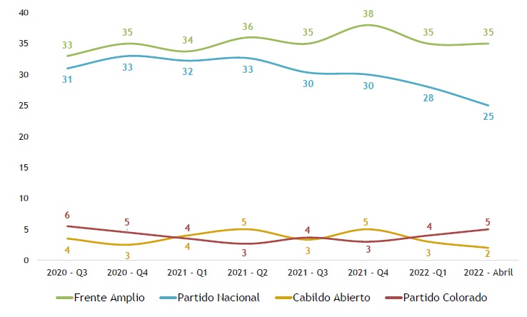 Al terminar abril, el Frente Amplio lidera con comodidad la simpatía política de los uruguayos con 35% de las preferencias, seguido por el Partido Nacional con 25%. Más distantes se encuentran el Partido Colorado (5%) y Cabildo Abierto (2%). Los otros partidos suman 1%, mientras hay una cifra significativa de orientaciones hacia el voto blanco o nulo (7%) y una mucho más significativa aún de indecisos (25%).