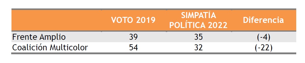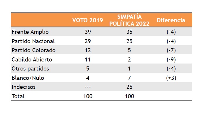 El Frente Amplio obtuvo el 39% de los votos y hoy tiene el 35% de las adhesiones, por lo que tiene un balance de -4. El Partido Nacional tuvo el 29% de los votos y hoy registra 25%, por lo que también obtiene un -4. Es decir, comparados con la elección anterior, los dos principales partidos del sistema están por debajo de su votación en la misma magnitud absoluta (aunque, en términos relativos a su propio electorado, la pérdida del Partido Nacional es mayor). El Partido Colorado y Cabildo Abierto, que recibieron el 12% y 11% de los votos respectivamente, hoy tienen 5% y 2%, por lo que su pérdida es de -7 y – 9.